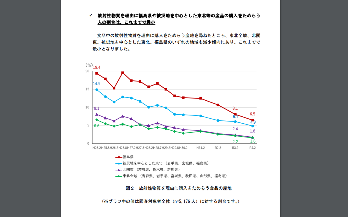 これを見ると、食品中の放射性物質を理由に購入をためらう産地として福島県産を挙げる者は6.5%に減っており、2013年の3分の1になっています。もはや、「そういう問い方をするからそう答える人が出る」レベルなんじゃないでしょうか?