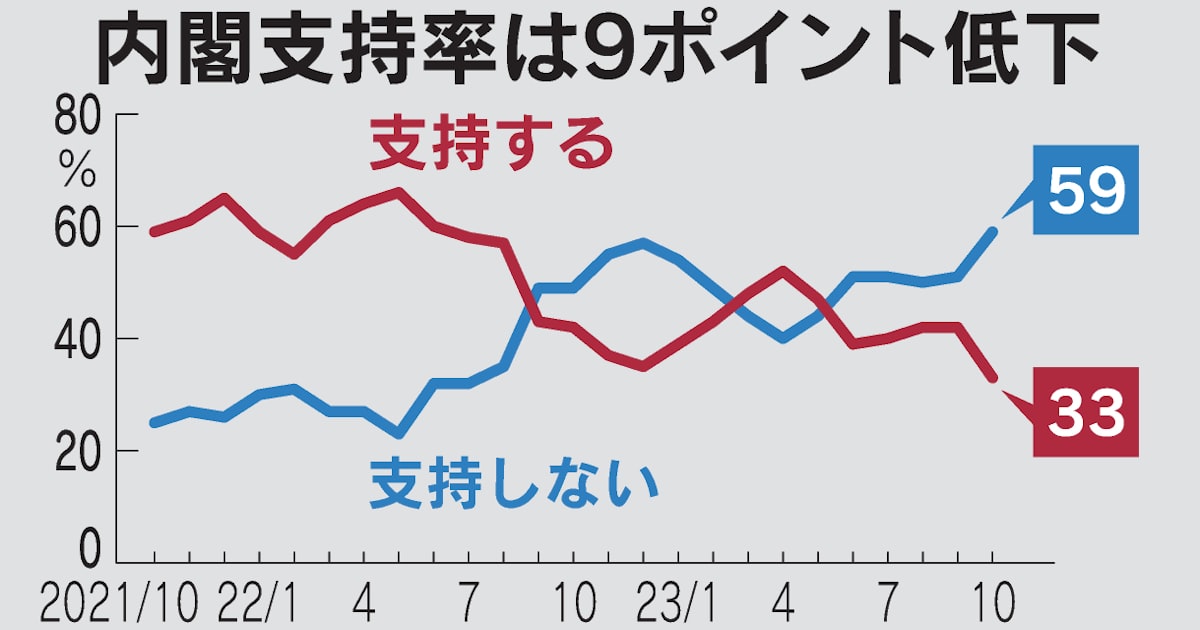 この結果、「岸田文雄内閣の支持率は33%で2021年10月の政権発足後、最低」となり、「内閣を「支持しない」は8ポイント上昇し59%」となった。