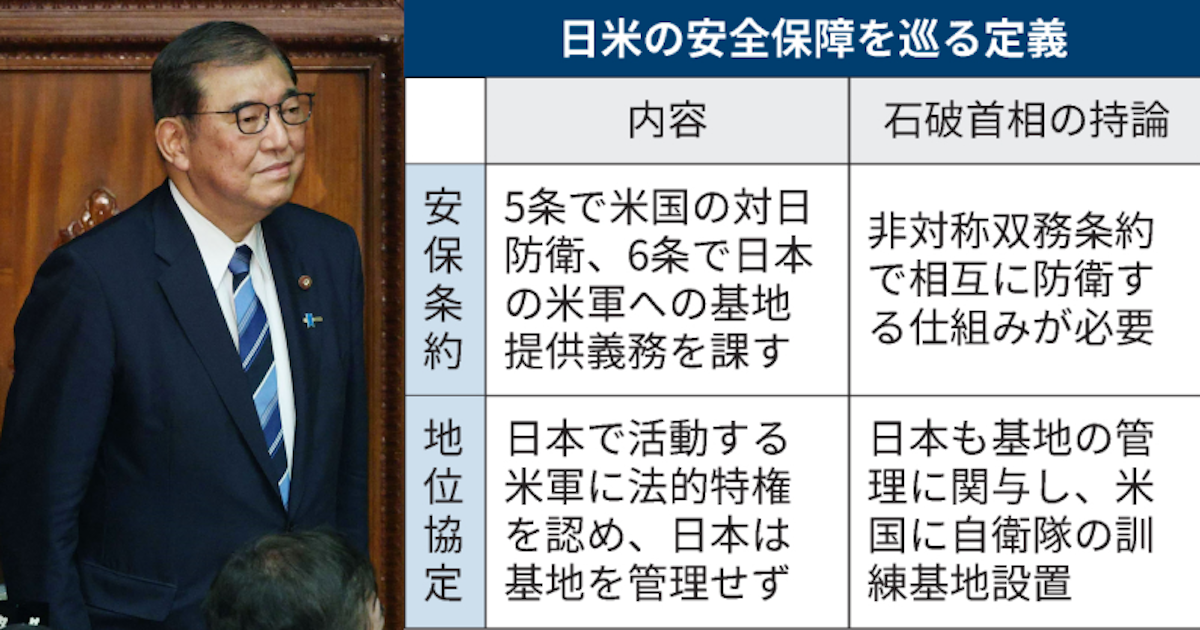 石破茂は、現行の日米安保を覆すものでもなく、自衛隊の修練も含めた地域に関して、アメリカに協力を求める、つまり安保条約と日米地位協定は別物であって、日本がアメリカに基地提供し協力しているように、相互主義でアメリカにも自衛隊に対して協力してもらうのは当然だ、との認識のようだ。これも、一見、尤もらしい言い分に聞こえるが、そもそも、日米地位協定という非常に高度な外交問題に関して、アメリカに事前協議を行った上で発言しているのか、大いに疑問だ。