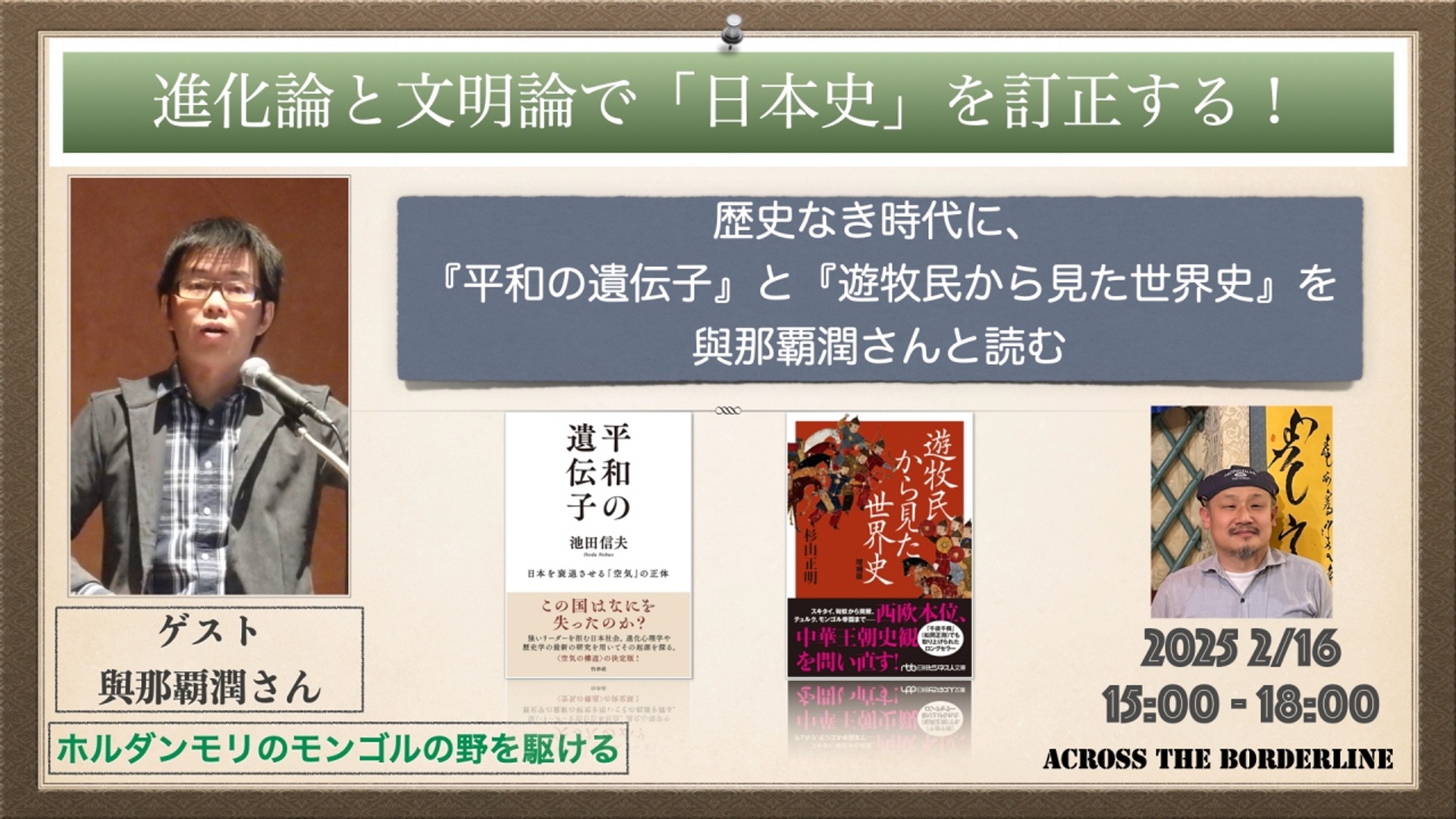 3度目のゲスト出演となる翼駿馬(ホルダンモリ)さんのシラスチャンネルでは、看板である「モンゴル遊牧民との対照」も踏まえて、じっくり議論したいと思っている。いわば、進化論と文明論を対話させる試みである。