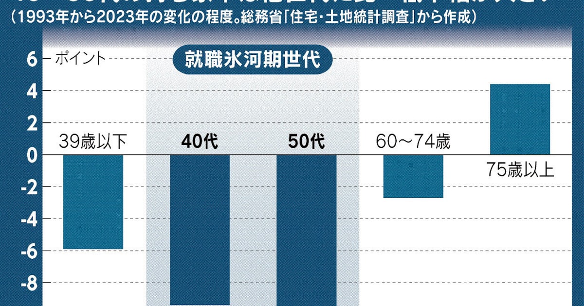 40~50代の持ち家率が急低下している。国の最新の調査では全世代平均は横ばいだが、30年前と比べ10ポイント前後も下がった。このまま高齢期に近づく人が多い。今のこの年代は就職氷河期世代(総合2面きょうのことば)といわれ、就職難に見舞われた。現在も経済的な苦境は続いており、老後の年金も多くを望めなければ賃貸に住むこともままならない。「安住の家」を求めてさまよい続けることになる。
