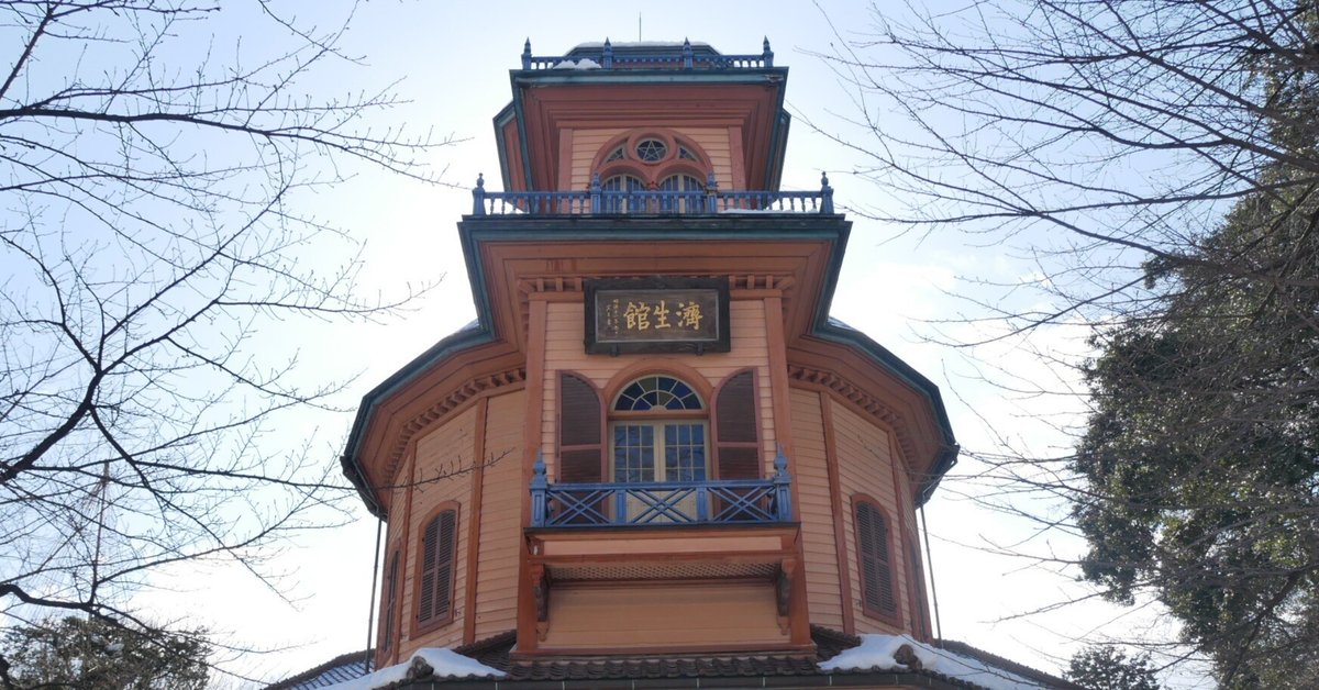 ルネサンス様式を基調とした木造瓦葺の建物。1階と2階の間にはコーニスと呼ばれる胴蛇腹の紋様を見ることができます。