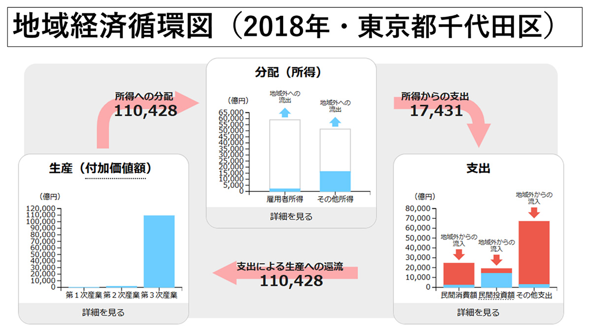 RESASで図7に示す地域経済循環図は、容易にすべての基礎自治体を作図できる。付加価値額ベースでお金が生産、そのお金は給料、納税として分配、分配で得られた所得は何かを購入することで消費、支出される、その流れを示している。