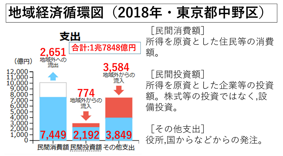 民間投資額は設備投資、その他支出は行政からの発注であり、地域外からの外貨を獲得できているが、民間消費は地域外に流出している。中野区民が区外で稼いでも、その勤務先でお金を使えば、地域外へ流出する。またネット通販で購入すれば、その支出は会社の所在地にお金が流出する。中野区民・区外の方にも中野区で買い物をしてもらわなければ、地域外へ流出し続けてしまう。