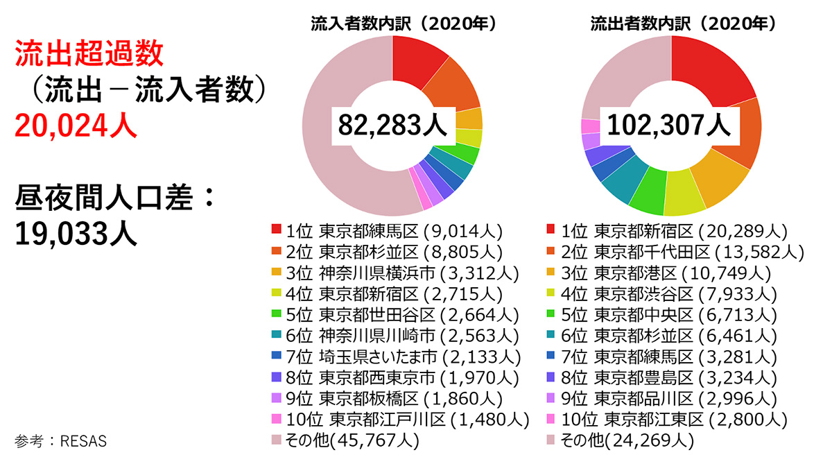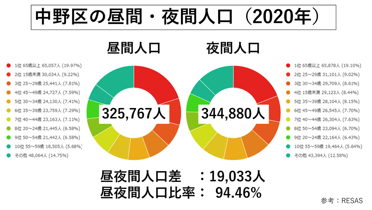 中野区においては他自治体からの流入者が82,283人、他自治体への流出が102,307人で、その差し引きで流出超過数は20,024人で、流出者の方が多いため、夜間人口よりも昼間人口が少なくなる。