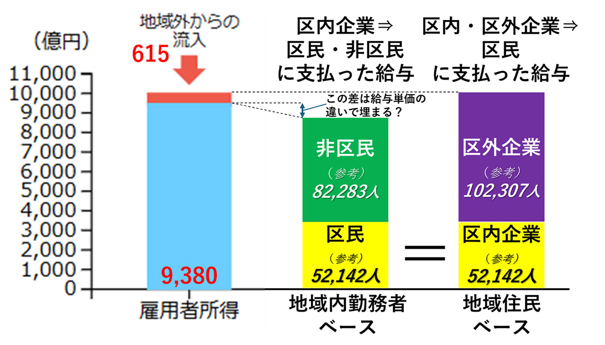 ここでは雇用者所得と地域住民ベースの給与を同じ高さにし、それぞれの区民、非区民、区内企業、区外企業に参考値としてその人口に按分する。参考値として参照したのはe-Stat:国勢調査/令和2年国勢調査/従業地・通学地による人口・就業状態等集計(主な内容:従業地・通学地による人口,昼夜間人口など)である。しかし約34.5万人の人口に対して、従業地・通学地「不詳」が約11.6万人であるため不確実性は高い。