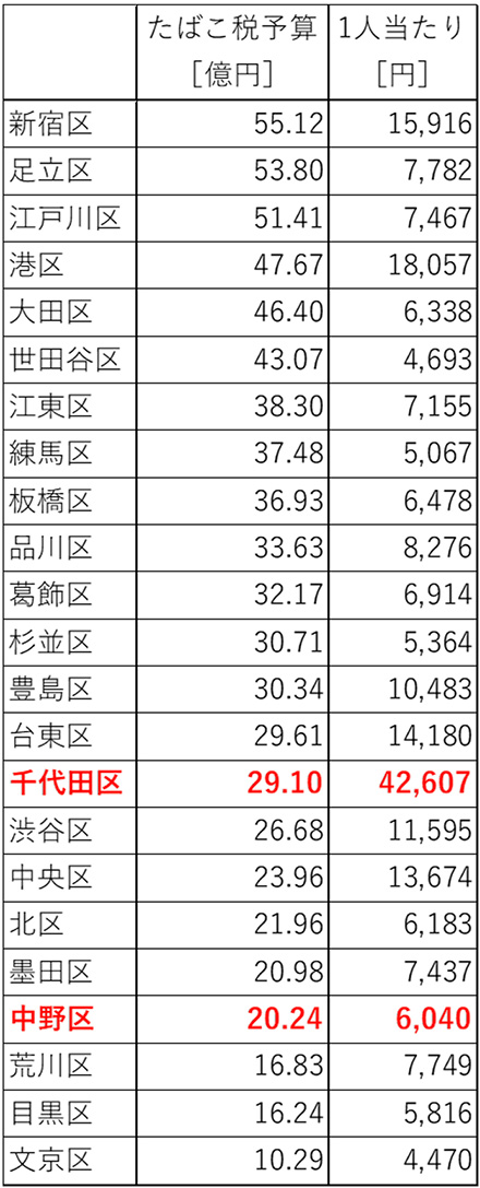 各自治体の大きな財源であるが、その税収はまちまちである。中野区の年間のたばこ税は20億円程度であるが、人口1人当たりに換算すると6000円程度になる。しかし千代田区においては人口一人当たり42000円であり、中野区の7倍となる。