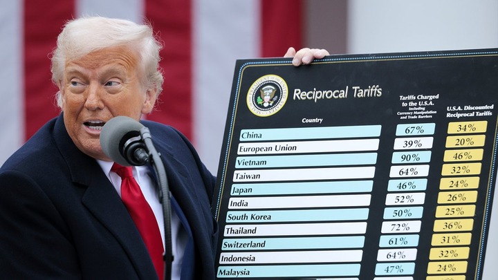 ホワイトハウスのローズガーデンでトランプはまず「4/5から発動される10%の一律関税(Universal Tariff)」を発表し、その上で「相互関税(Reciprocal Tariff)」と称して大きなリストを持ち出し、主に米国が貿易赤字を出している国々を名指しで4/9から発動される上乗せ関税を発表した。