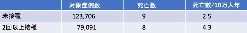 この年齢層の2回目ワクチン接種率は、大阪市は全国で最も低く、39%であった。2021年4月1日から2024年2月29日までの期間に、ワクチン接種群の死亡数は8人、未接種群の死亡数は9人であった。追跡期間を考慮して、人年法を用いて両群間の死亡率を比較したところ、2回以上接種群の10万人年あたりの全死因死亡数は4.3人で、未接種群の2.5人を上回った(表3)。