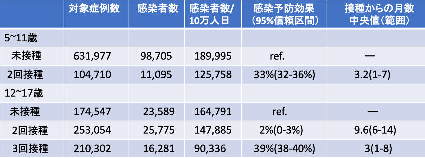 表1 日本の小児に対するコロナワクチンの感染予防効果(BA4/5流行期)