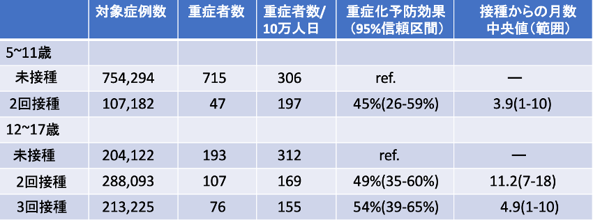表2 日本の小児に対するコロナワクチンの重症化予防効果(BA4/5流行期)