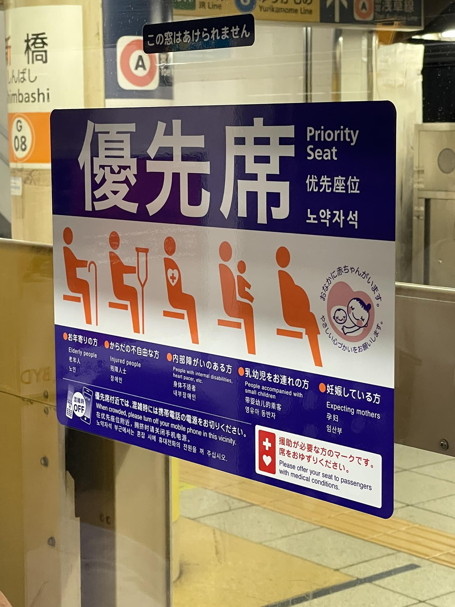 今日乗車したメトロ銀座線は、ビジネス客と観光客、そして外国人で大変混雑していましたが、やはり優先席は空席でした。
