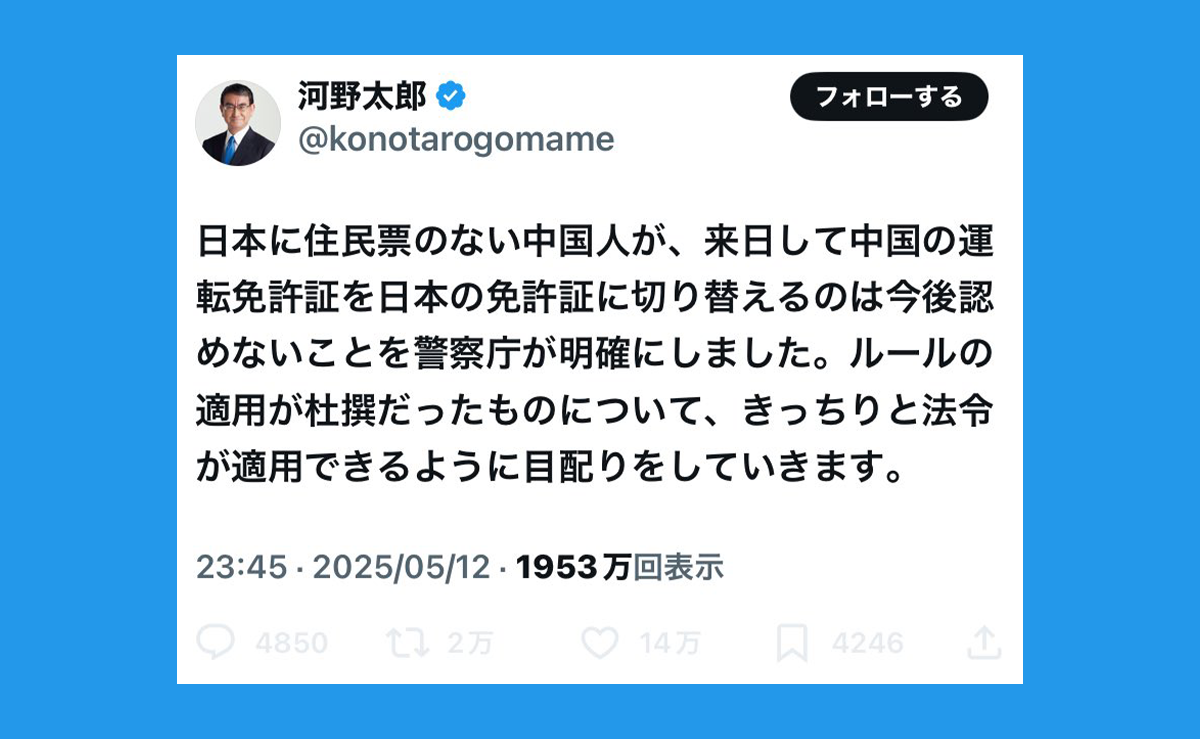 日本に住民票のない中国人が、来日して中国の転免許証を日本の免許証に切り替えるのは今後認めないことを警察庁が明確にしました。