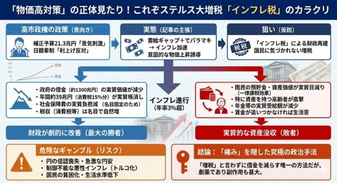 インフレ税は、すべての国民への一律課税になる。3%のインフレが1年続くと、政府の実質債務は3%減る。日本の政府債務は約1300兆円なので39兆円、消費税の15%分である。そのしくみをnano banana proは「ステルス大増税」と名づけた。