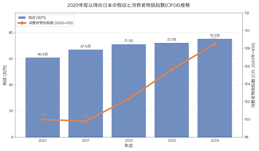 2020年度以降の消費者物価指数(折れ線)と税収(棒グラフ)