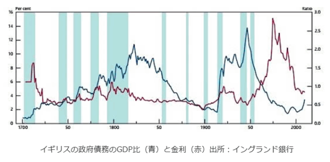 イギリスも戦時中にできたGDPの2.5倍の政府債務を戦後、インフレ税で返済した。特に1970年代には10%を超えるインフレ率が10年近く続き、サッチャー政権が長期金利を14%まで上げ、政府債務が一挙に減った。
