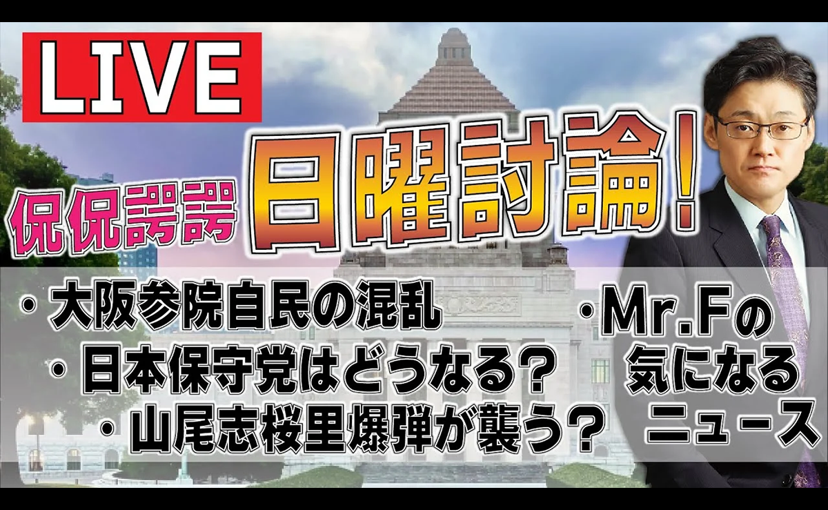 今回は「ライブ! 侃侃諤諤!日曜討論!! 山尾しおり爆弾が国民民主を襲う! 日本保守党はどうなる? 大阪参院自民の混乱」をお送りいたします。