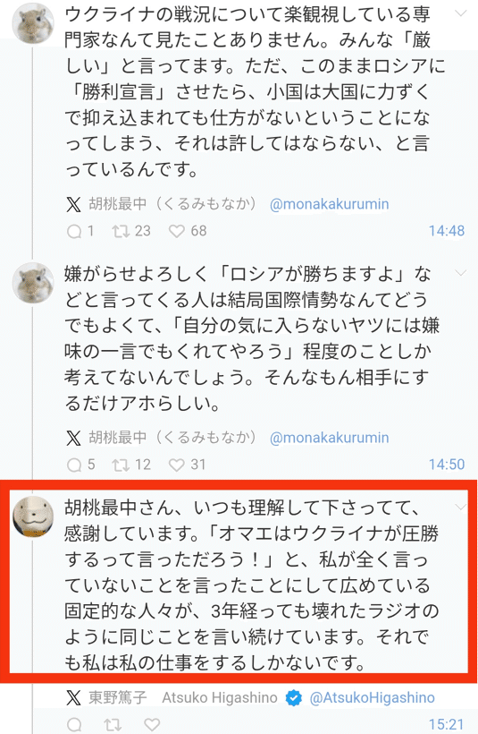 22年2月の開戦当初に、日本の識者の一部が「ウクライナは降伏を」と唱えたのは事実である。しかし、それが「幅を利かせて」いたかは疑問で、むしろ批判を集め炎上していたのが実態だろう(私も批判した)。