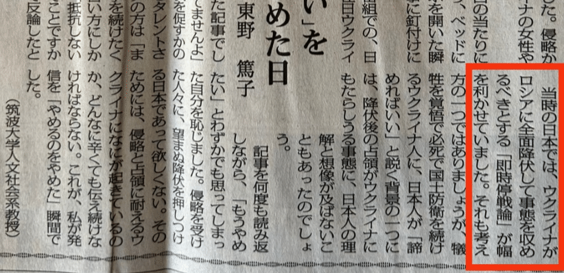 より大きな問題は、とにかく戦闘停止を優先すべきとする「即時停戦論」の内容を、東野氏が「ロシアに全面降伏して事態を収めるべき」なる議論と、混淆させて記述している点だ。あたりまえだが、停戦と降伏は違う。