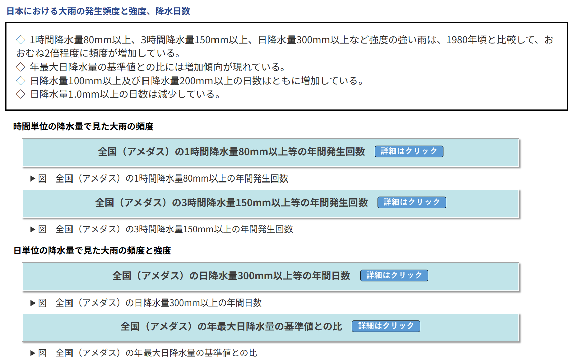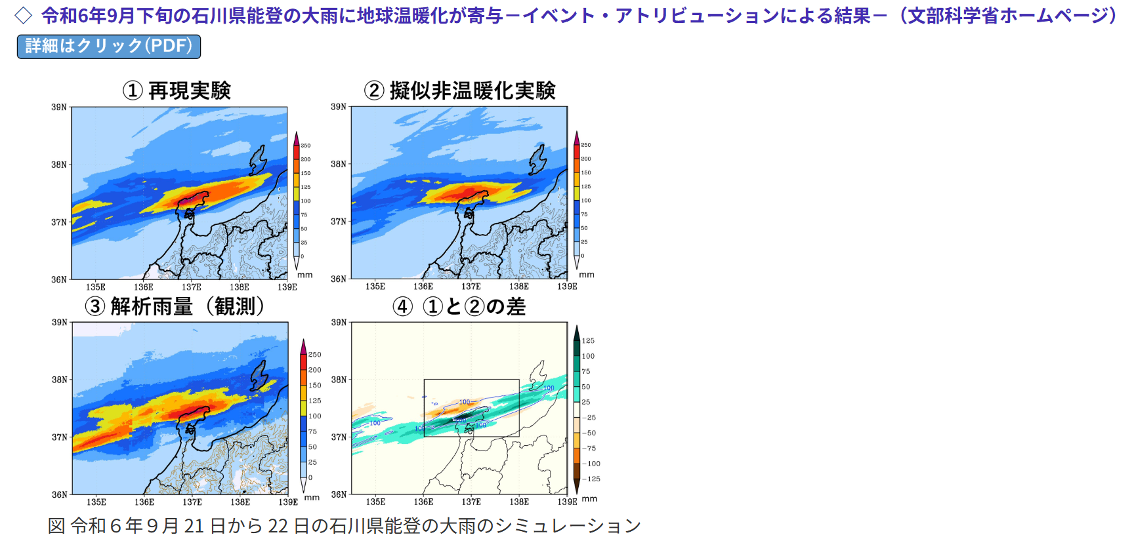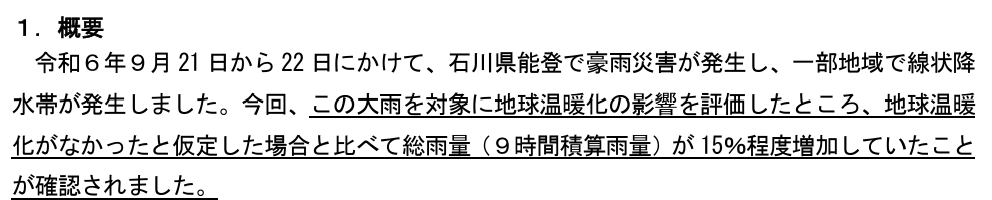 レポートの冒頭で紙幅を割いて紹介されているのは石川県能登の大雨に関する「イベント・アトリビューション」の研究結果である。「詳細はクリック」を押すと、地球温暖化によって雨量が15%増加した、と書いてある。