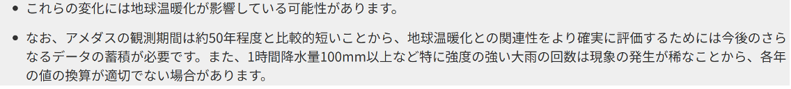 大雨が増えることには、クラウジウス・クラペイロン関係が寄与している可能性はあるが、それによる雨量の増大があったとしても1℃あたり6%程度に留まる。1980年以降に大雨の頻度が大きく増大しているならば、それは大半が自然変動であろう。