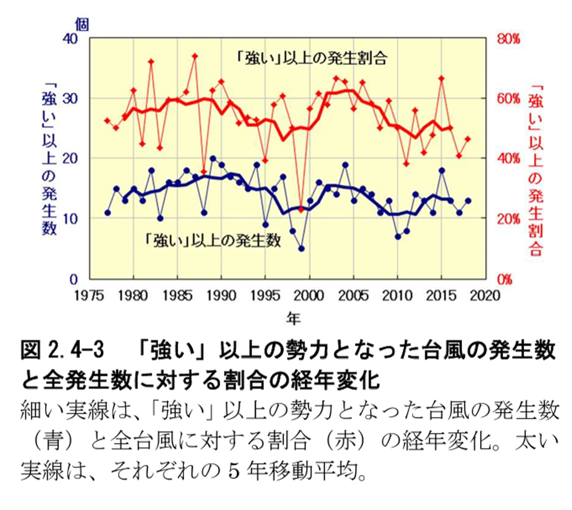 しかし、台風が激甚化していない、というのはきわめて重要な情報だ。そして、以前の「レポート」では、そのようなデータははっきり示されていた(図中、「強い」以上とは、瞬間風速33メートル以上であることを指す)。