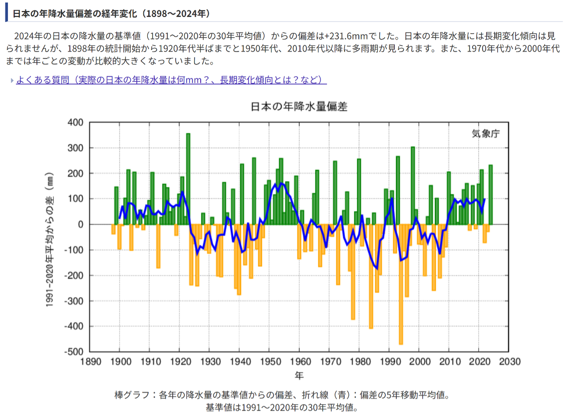 1980年頃から後だけ見れば、日本の年降水量自体が増えている。大雨が増えてもおかしくない。ところが、1950年代を見れば、いまと同じぐらいの雨量になっていて、この頃は、大雨の頻度も大きかった。