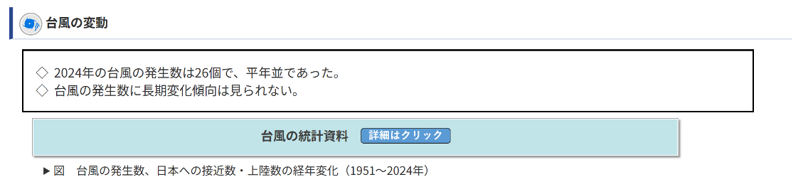 「1980年以降の大雨」という、地球温暖化との関連があるかどうかもよく分からないデータについてはやたら詳しく載せた上で、台風についての記述はさらっとしている。頻発化も激甚化していないからだ。