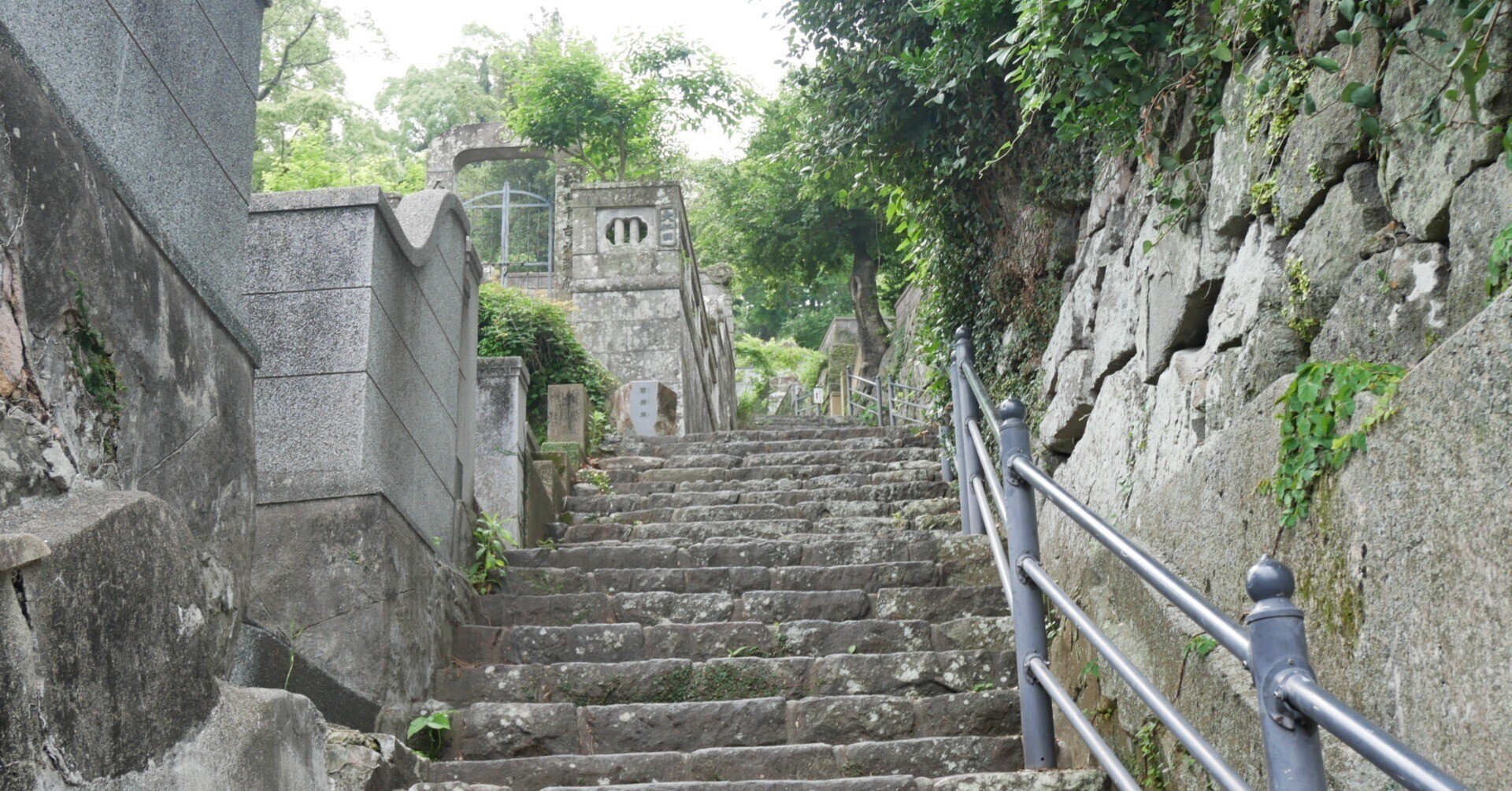 幣振「坂」といいますが、道の大半はこのような階段。この先に墓地があって、この日も何人かの方が墓参りに来ていたのですが、ここを日常的に上り下りするのはほんとうに大変だと思います。ちょっと登っただけで汗だくだく、脚が震えます。