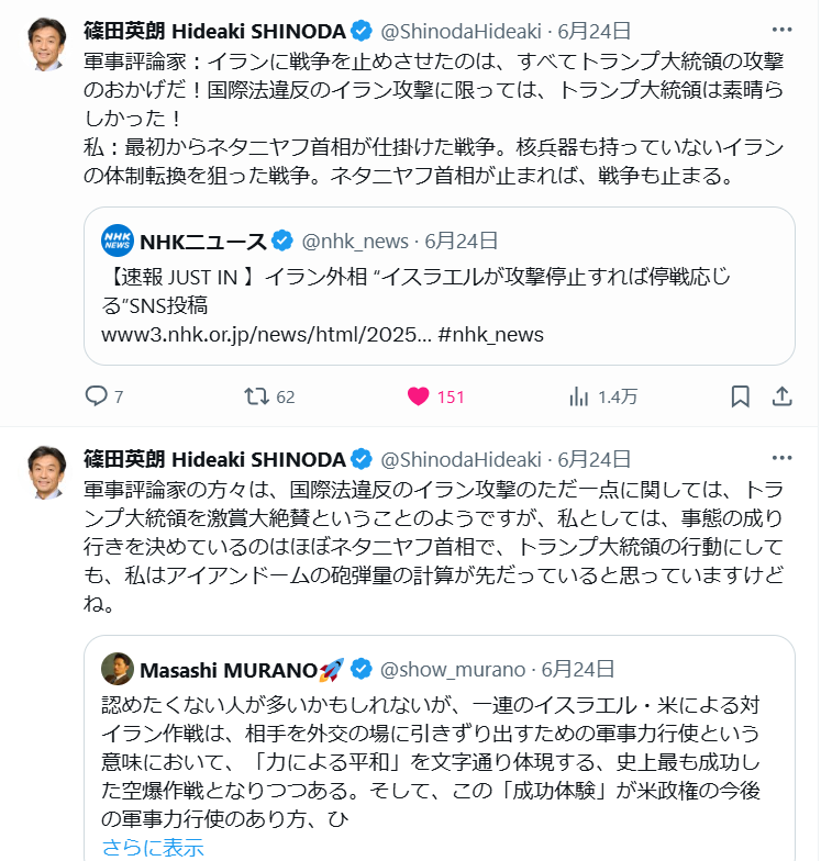 これはアメリカの攻撃が、単なる第三者的な核施設の除去という意味を持つだけでなく、イラン・イスラエル戦争の一環として、イスラエル側を支援する目的で行われたがゆえに、紛争当事者の行動としての意味がある、という点を指摘した文章だった。アメリカは、戦争を仕掛けたイスラエルのネタニヤフ首相の意向に引きずり込まれてしまう、ということを指摘したものだった。