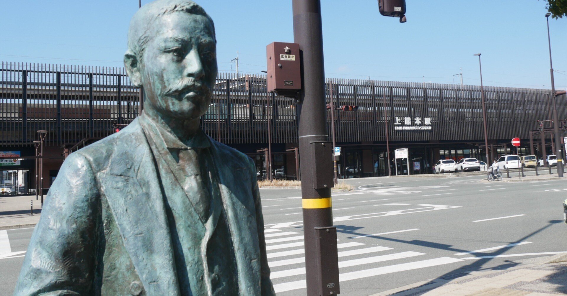 上熊本から熊本城方面に向かう通りを「わが輩通り」といいます。実は熊本は日本を代表する文豪である夏目漱石が1896年から1900年までの間過ごした場所。漱石はここで熊本大学の前身である第五高等学校の英語教師として教鞭をとっていました。「坊ちゃん」のイメージが強く、夏目漱石といえば松山のイメージが強いですが、熊本にも所縁の深い作家です。