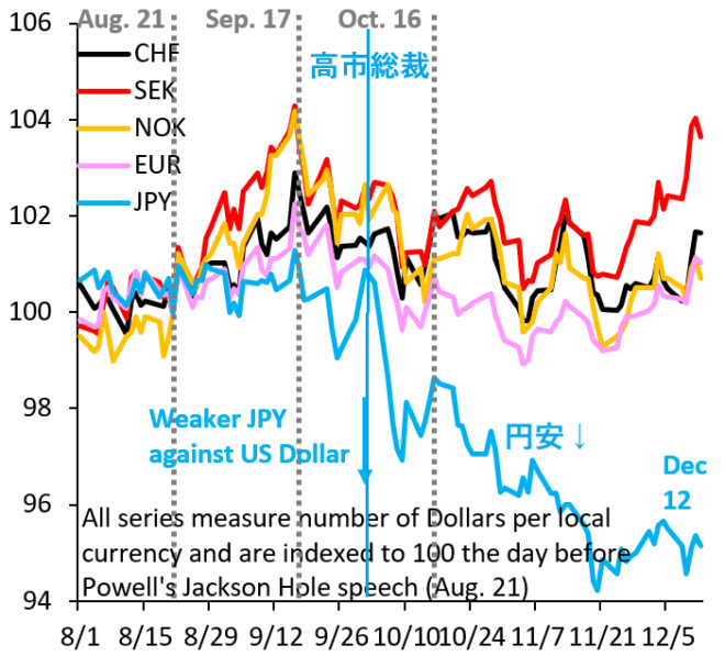 急激な円の流出が起こっている。長期国債は買い手がつかなくなって金利が2%近くに上がったが、日米の金利差が縮まっても円は上がらない。世界の主要な通貨の中で、円だけが暴落している。そのきっかけは、10月初めに高市氏が自民党総裁になったときだ。