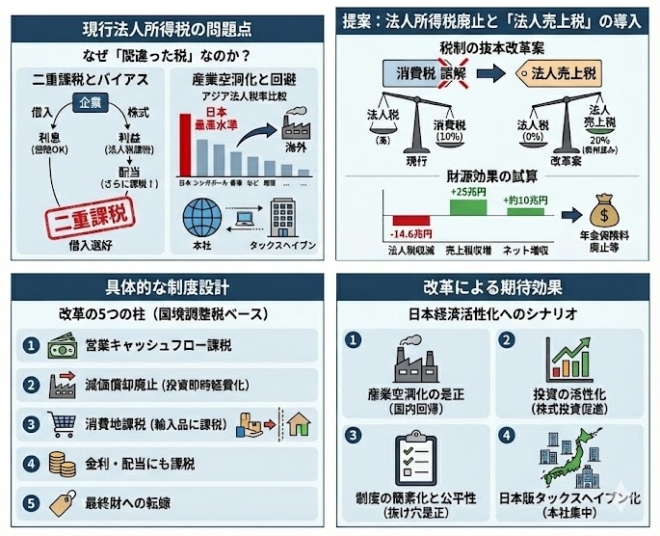 法人売上税になると、海外生産で税を逃れることはできなくなる。製品を輸入して販売したら、消費地の国内で課税されるからだ。課税対象をキャッシュフローに統一し、金利にも配当にも課税すると、銀行貸し出しは減るが、株式投資は促進される。