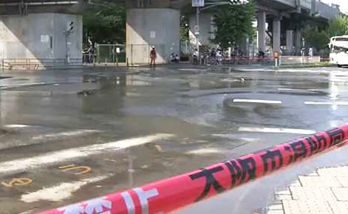 7月5日午後、大阪市東淀川区の国道479号線「大隅1」交差点で、地下の工業用水道管が破裂し、大量の水が噴き出して道路が冠水しました。警察と大阪市水道局が現場に対応し、交通規制が敷かれました。水は約20メートル四方にわたり広がり、複数の路面亀裂も確認されています。