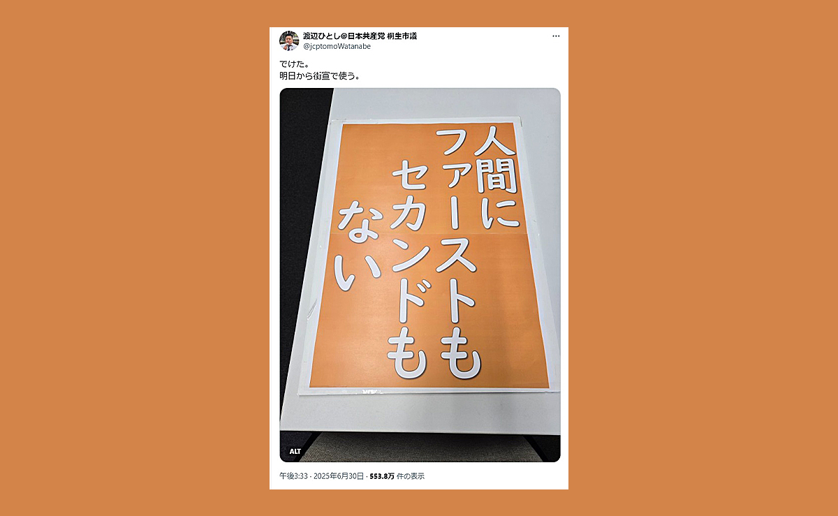 参政党の日本人ファーストに対して共産党の連中が一斉に「日本人ファーストは差別だ!」とか言い出していることに対してさらに批判が出ていることに対して共産党の渡辺ひとしとかいう市議がちょっとうまいことを言ったつもりになってこんなのを出してきました。街宣で使うそうです。