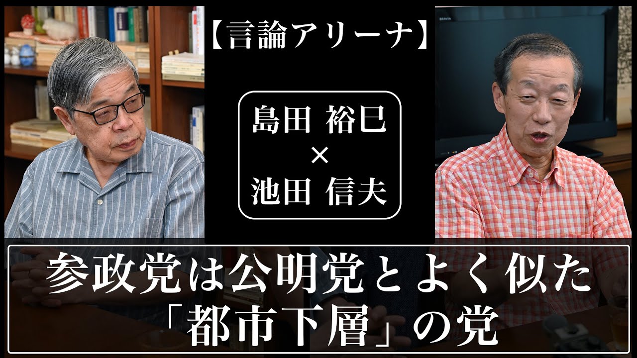 参院選で躍進した参政党は、反ワクチンから出発した運動ですが、外国人排斥などの右翼思想も主張して正体不明です。その支持層は、大企業や労組などの既存組織に所属しない非正規労働者や自営業などの「都市下層」の住民で、公明党に似ていると島田さんは指摘します。