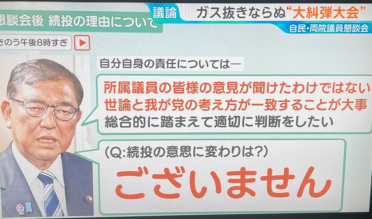 28日の両院議員懇談会を終えても、石破首相の口から出てくるのは〝(続投の意思に変わりは)「ございません」〟の一点張りである。