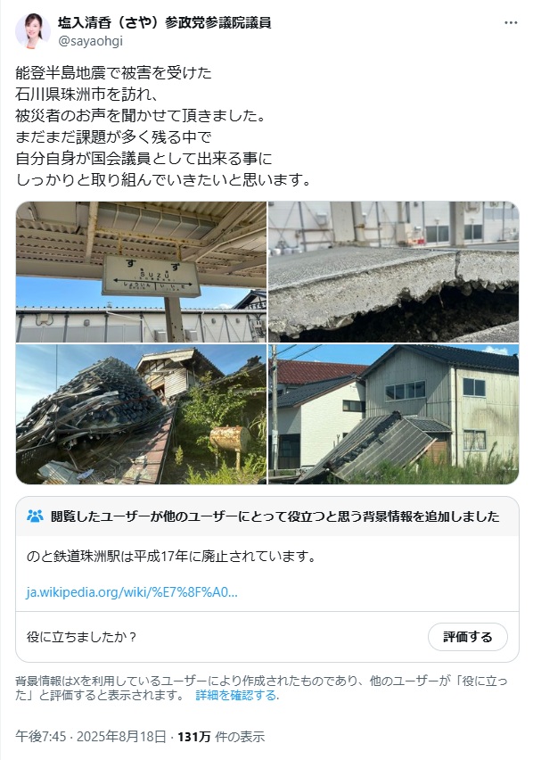 さて、参政党のさやとかいう議員が被災地訪問パフォーマンスで国会議員として仕事しているアピールをしていました。