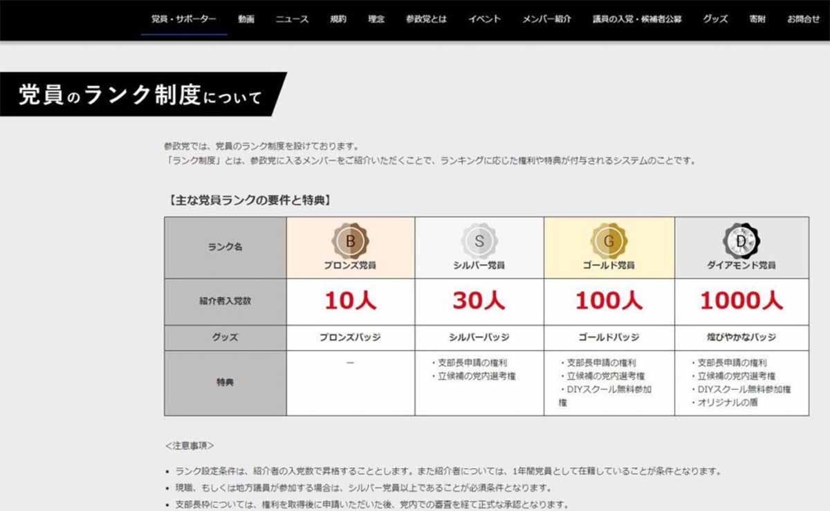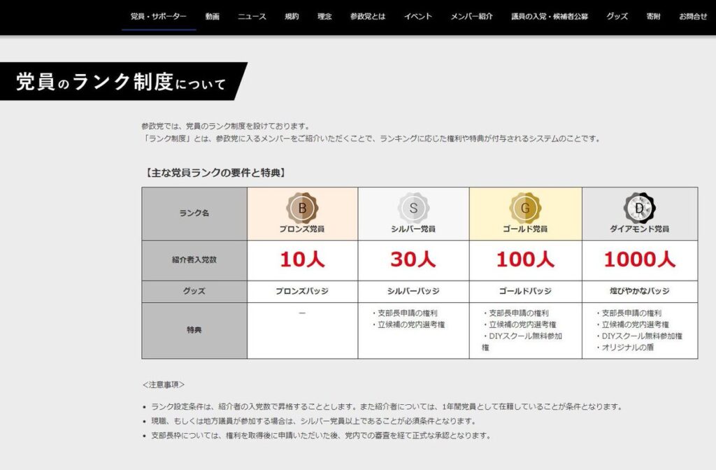 マルチそのものと指摘されて現在は公式HPから削除されていますが、参政党のこの党員ランクシステムも、マルチの手法そのものと言っていいでしょう。