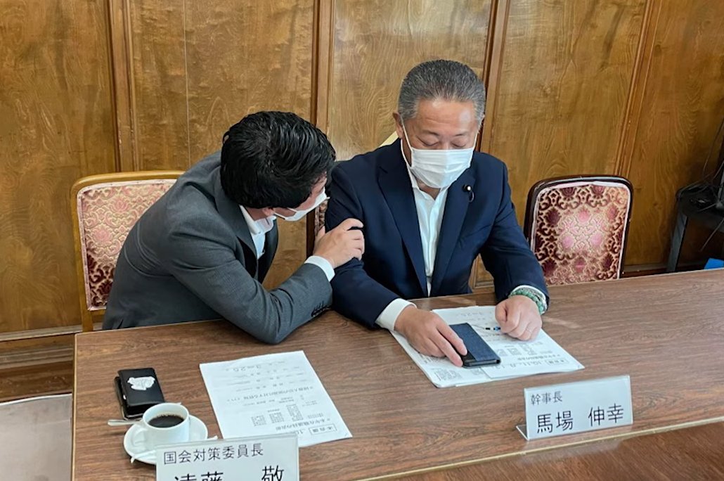 馬場幹事長に候補者を撤回しろと縋り付く小川淳也立憲民主党幹事長