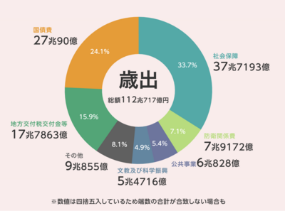 ・一般会計(FY2025)115.5兆円。内訳:社会保障33.1%(38.3兆円)、地方交付税等16.5%(19.1兆円)、国債費24.4%(28.2兆円)など。利払いは10.5兆円。