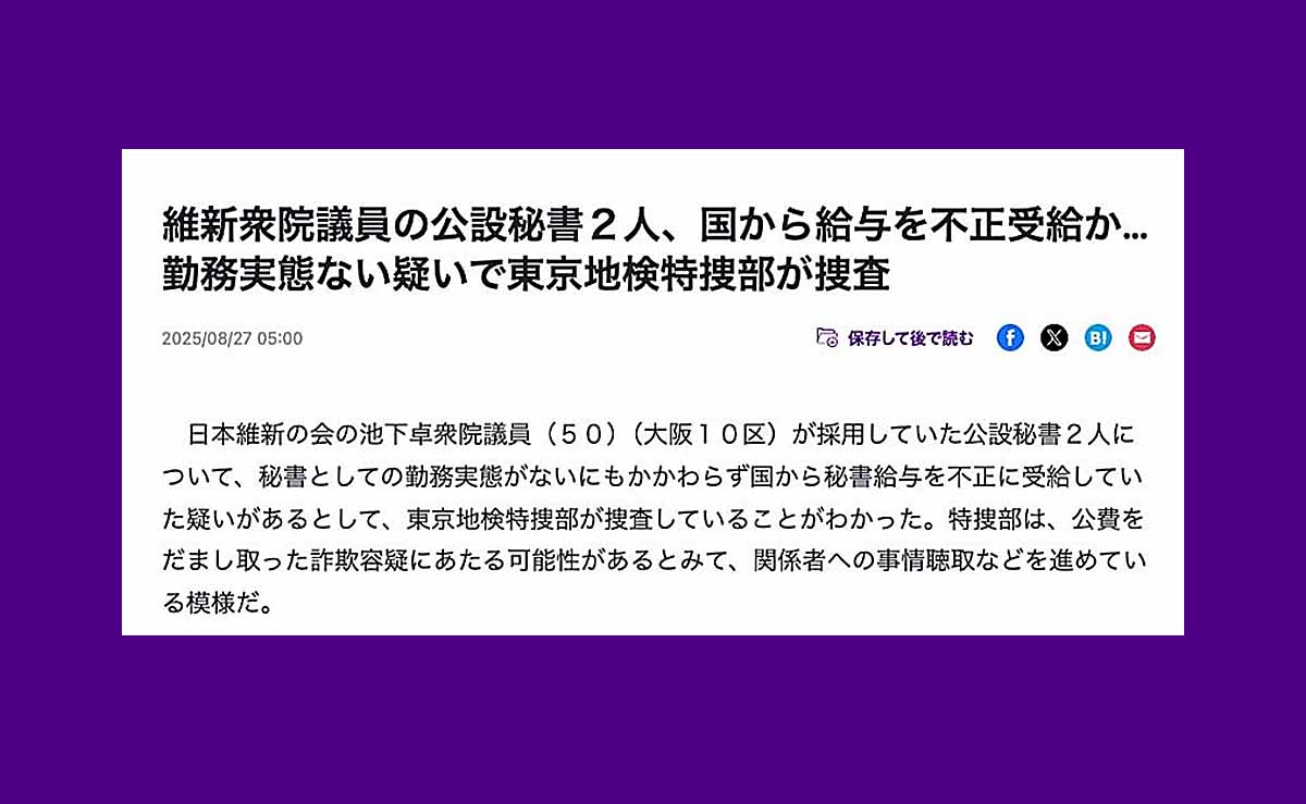 読売新聞は8月27日の朝刊1面で、日本維新の会の池下卓衆院議員の公設秘書2人が勤務実態のないまま給与を受け取っており、東京地検特捜部が捜査していると報じました。