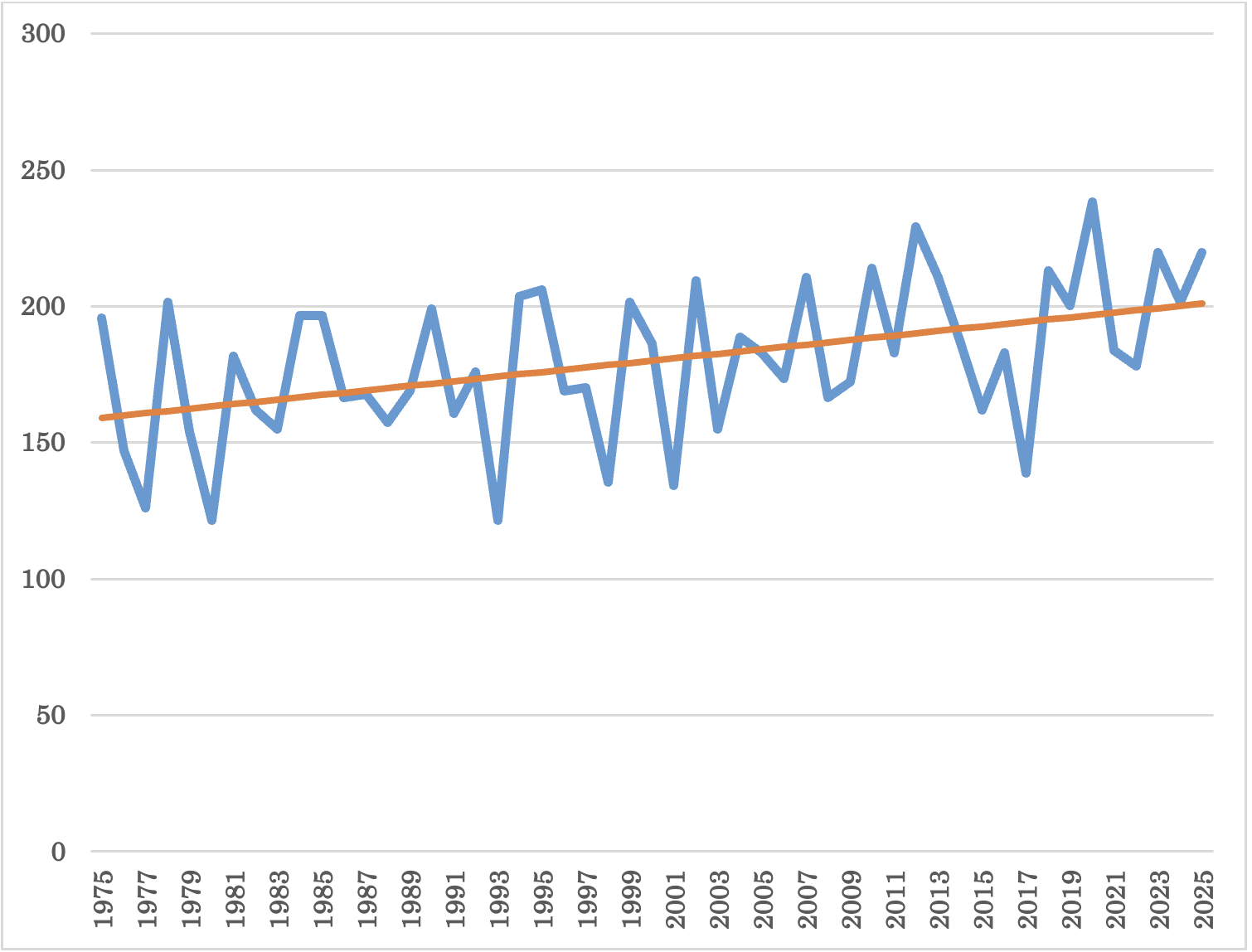 図中、赤いのは回帰直線。2025年には、1975年よりも26.4%も全天日射量が増えていた!