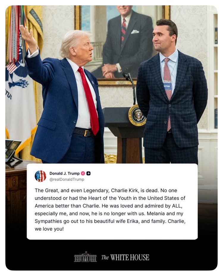 In honor of Charlie Kirk, President Trump is ordering all American flags throughout the U.S. to be lowered to Half Mast. pic.twitter.com/FOYHIZU2FD