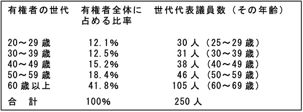 表1 世代選挙人の割合と世代代表の議員数