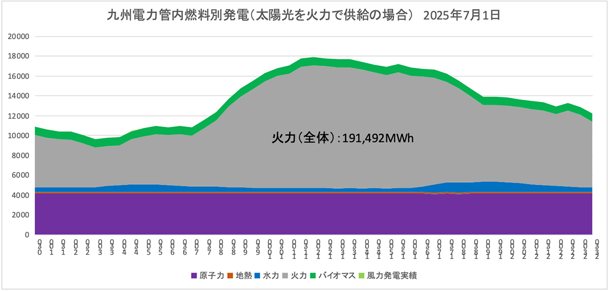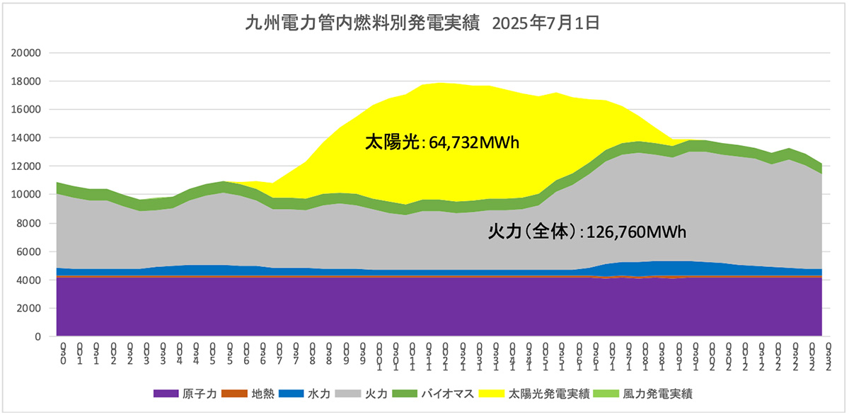 図1 九州電力管内の燃料別発電実績(2025年7月1日)
