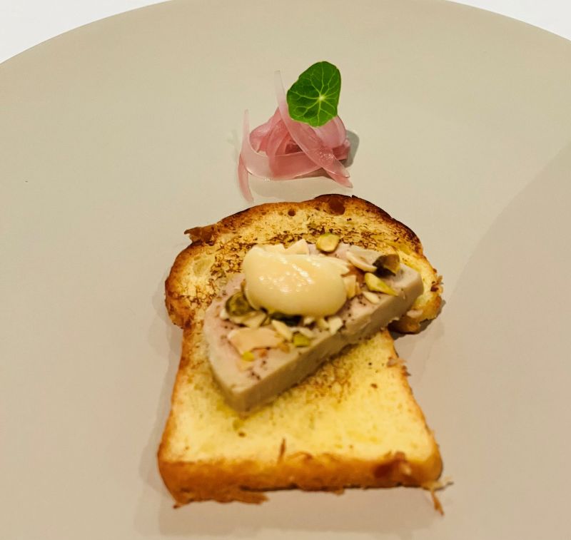 トーストしたブリオッシュにフォアグラ、リンゴのピュレ、赤玉ねぎのピクルスを添えた王道の一皿。ロゼのノンアルコールスパークリングがぴったり。