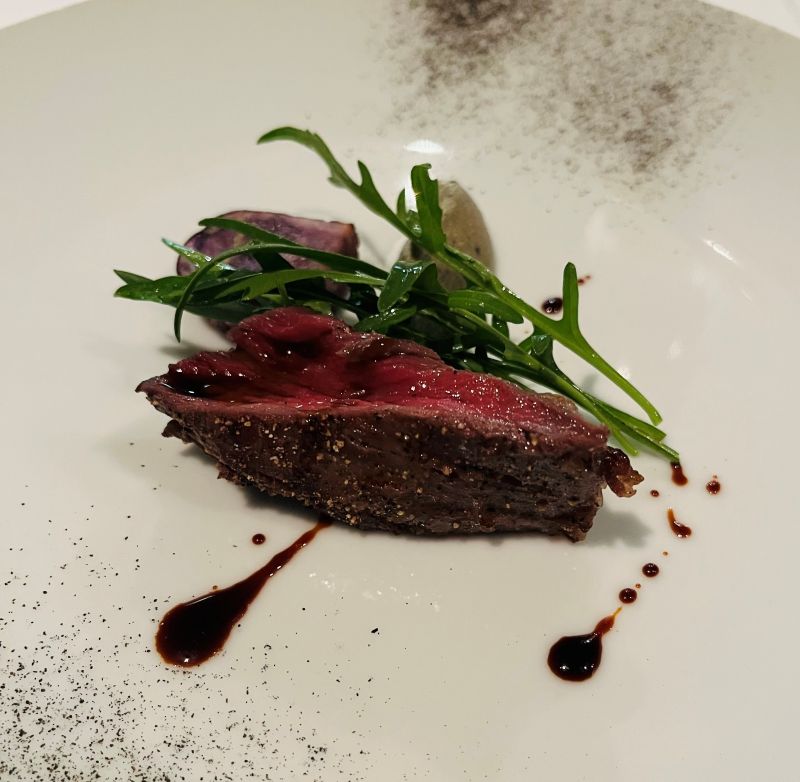 5年続く定番、炭火の香りと旨味が豊か。黒茄子のパウダーと紫色のシャドークイーンが、深みのある味わいとともに美しい色彩を添えていました。