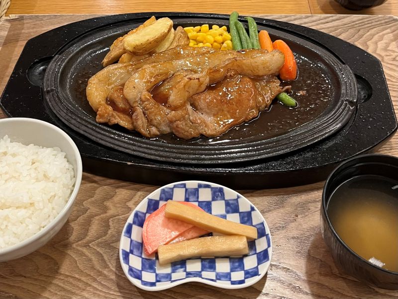 毎回のように注文する、長谷川自然牧場の豚肉を使ったポークジンジャー、和食セット。