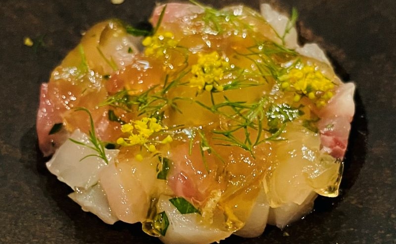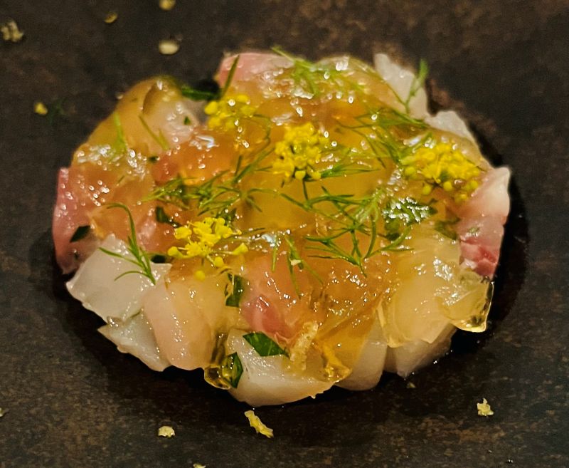 ディルやイタリアンパセリの香りに、レモンゼストの酸味。牛コンソメジュレがメバルの旨味を引き立て、ひと口ごとに新鮮な驚き。